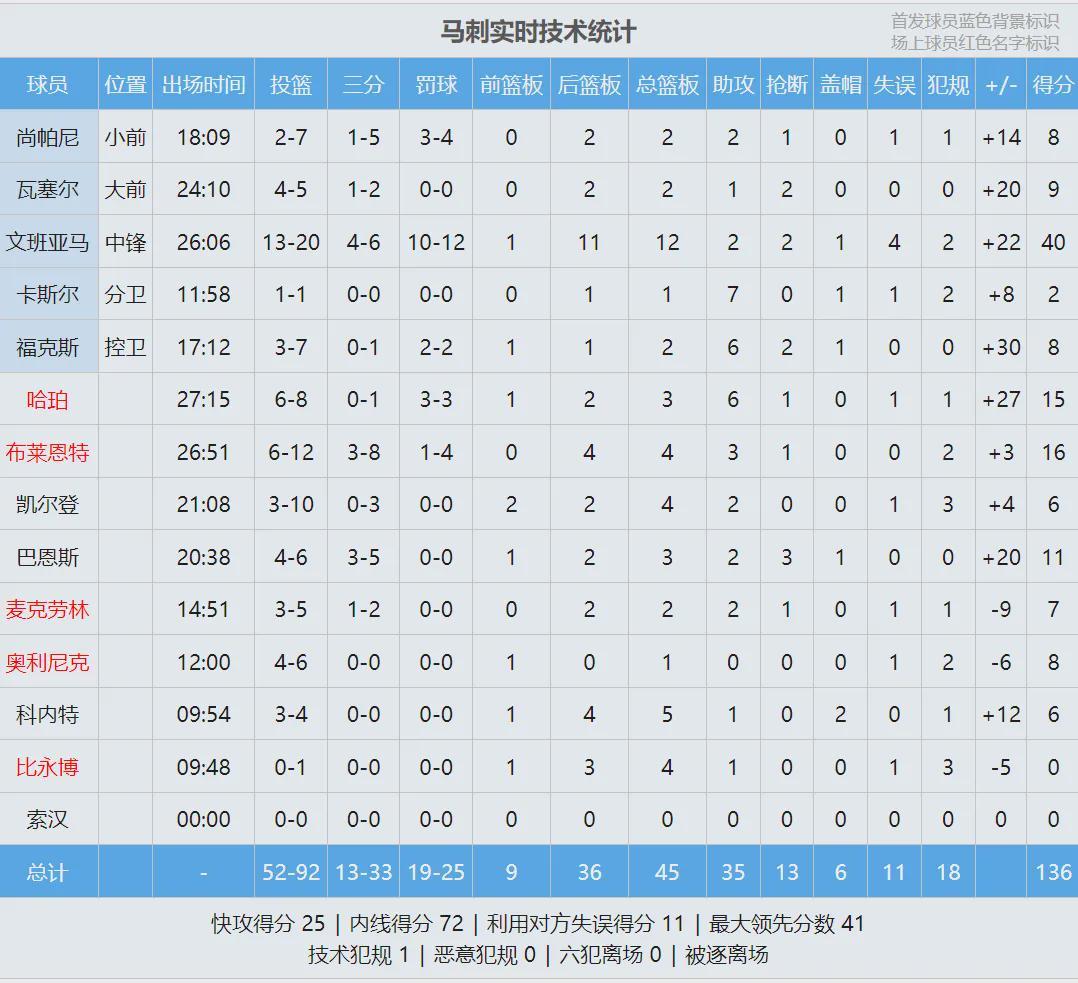 湖人进攻还算不错,首节得到30分,但马刺全队单节轰下47分。文班亚马第一节只打了8分钟,9投8中狂轰25分3篮板1抢断1盖帽,一个人打爆湖人全队。第二节海斯多次在篮下单挑文班亚马,一个人连拿7分,随后湖人连续失误。